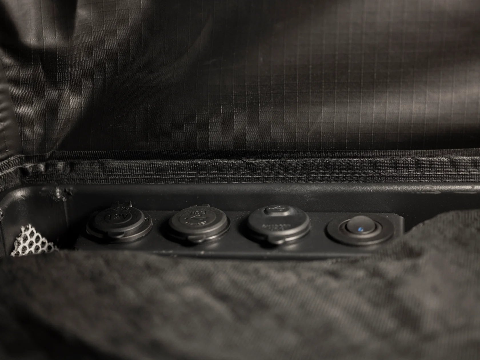 Integrated 12 V power system with LED strip, USB ports, and Anderson plug