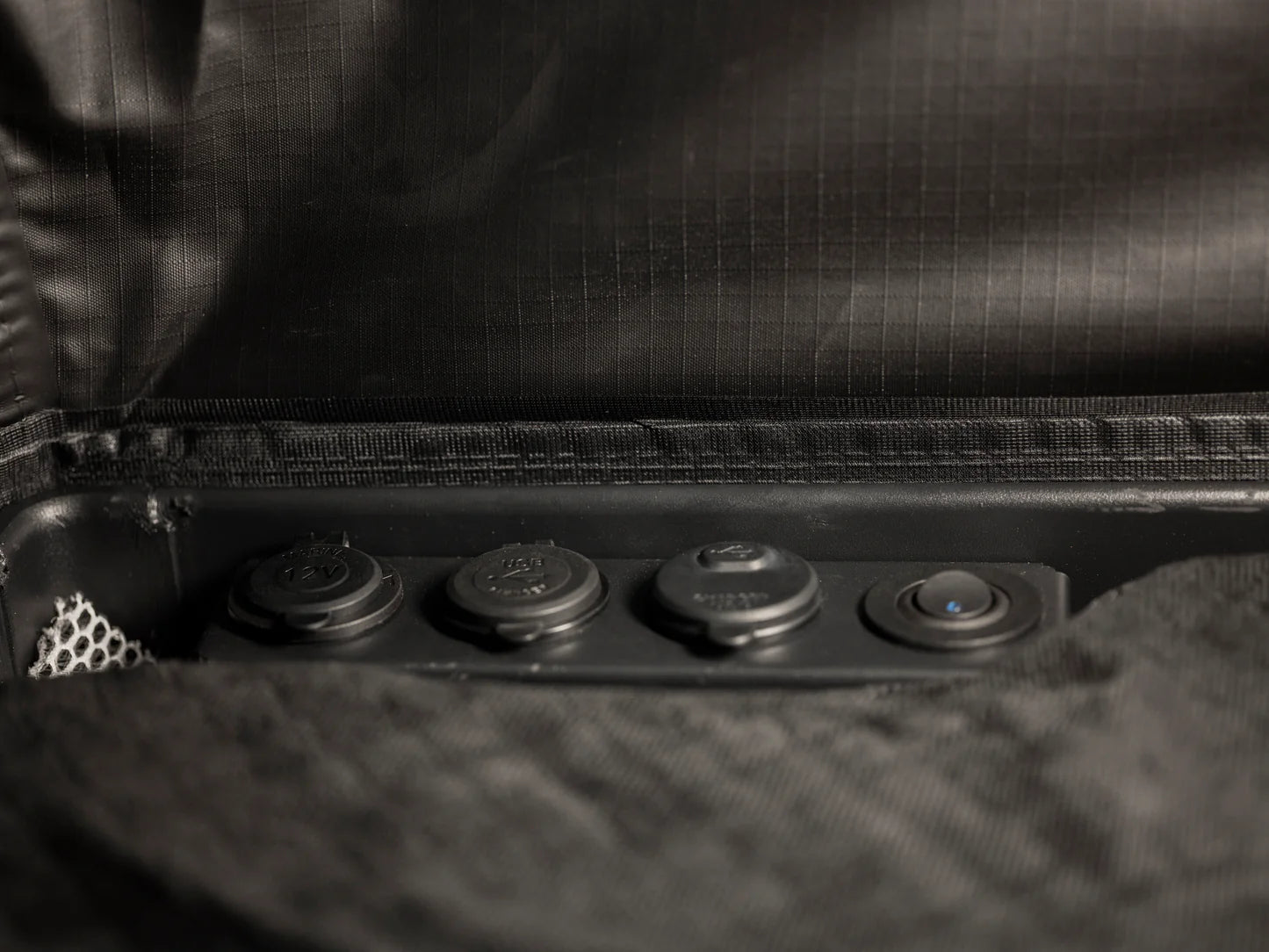 Integrated 12 V power system: LED strip, USB ports, cigarette socket, and Anderson plug