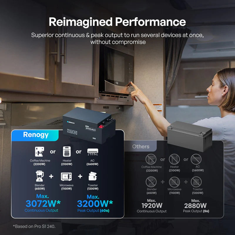 Renogy Pro batteries can steadily deliver over 3000W output* to run 99% of appliances in your motorhomes, such as air conditioners, coffee machines and hair dryers. With strong peak output, they enable simultaneous operation of microwaves, blenders and high-power appliances. So you don't have to compromise comfort all year round.